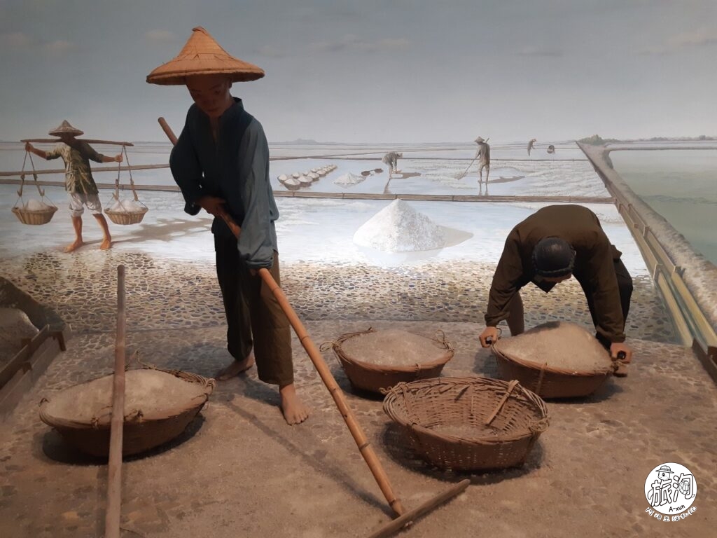 ▲鹽田是濱海地帶產製食鹽的設施。蠟像重現了在鹽田辛苦工作的景況༼ •̀ ں •́ ༽