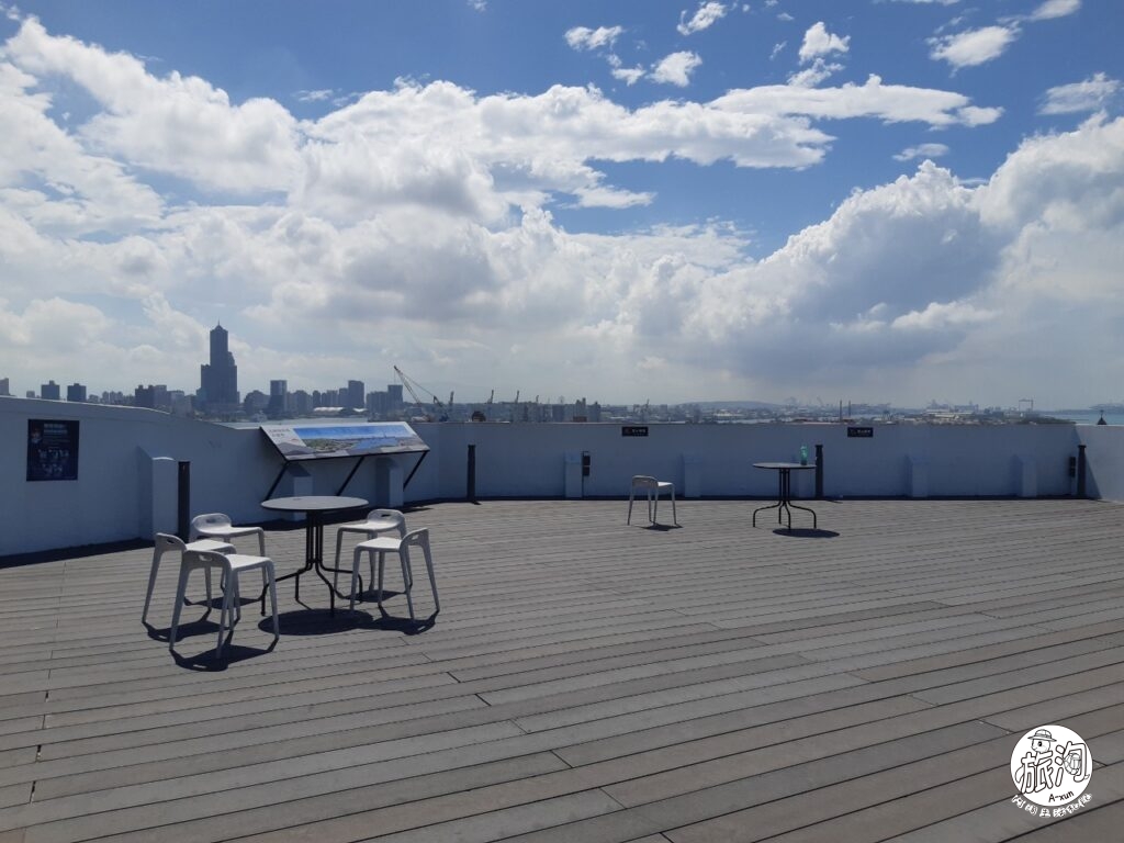 ▲面向高雄港的這個風景,是個露天觀景台兼座位區,但白天不太適合作這邊喝飲料休息,畢竟太熱了,夜晚可能就會是不同的光景٩(●ᴗ●)۶