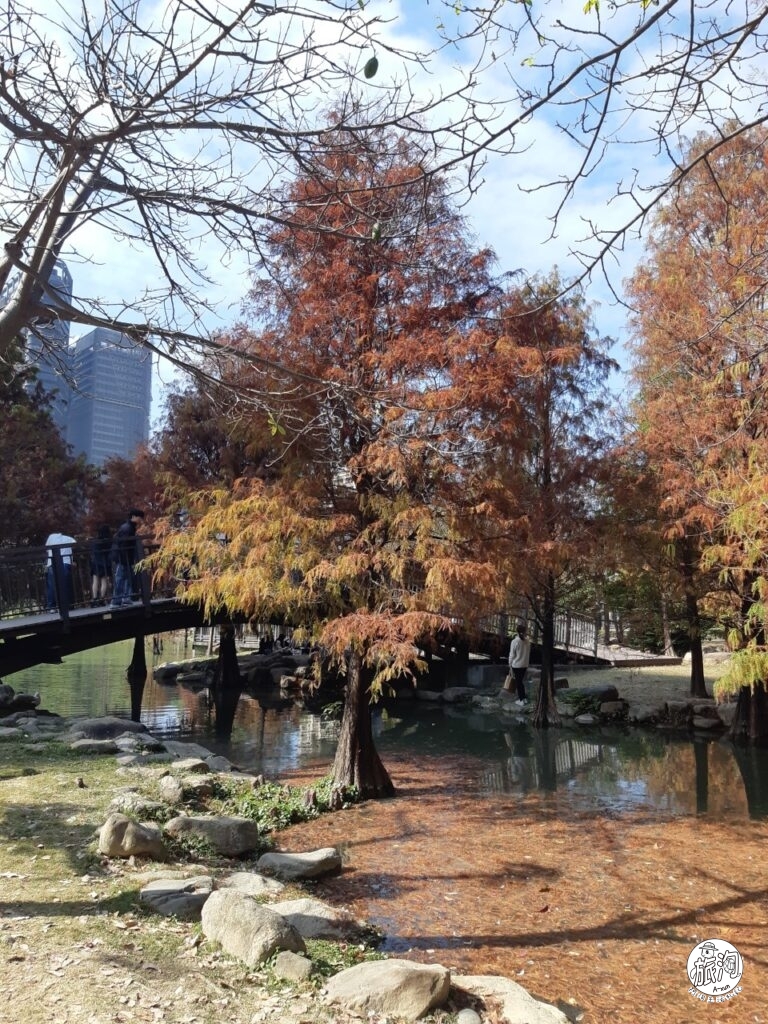 還真沒想到凹仔底森林公園,竟然在最近頻頻登上社群平台。原來是落羽松美景,近期逐漸轉紅,將原本綠色的公園,染上一片美麗的淡紅色。尤其是公園裡的生態溼地區,配合濕地生態,現場就像是另一片秘境一樣,完全無法想像這是在車水馬龍的都市中,會出現的景色。只能說幾年前種下的美好果實,在今年結出美好成果的時刻到了٩(๑❛ᴗ❛๑)۶