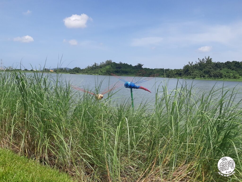 ▲會被稱作蜻蜓湖畔平台,主要也是因為佇立在水中的這兩隻蜻蜓裝置藝術,可惜一樣被雜草遮住大半><