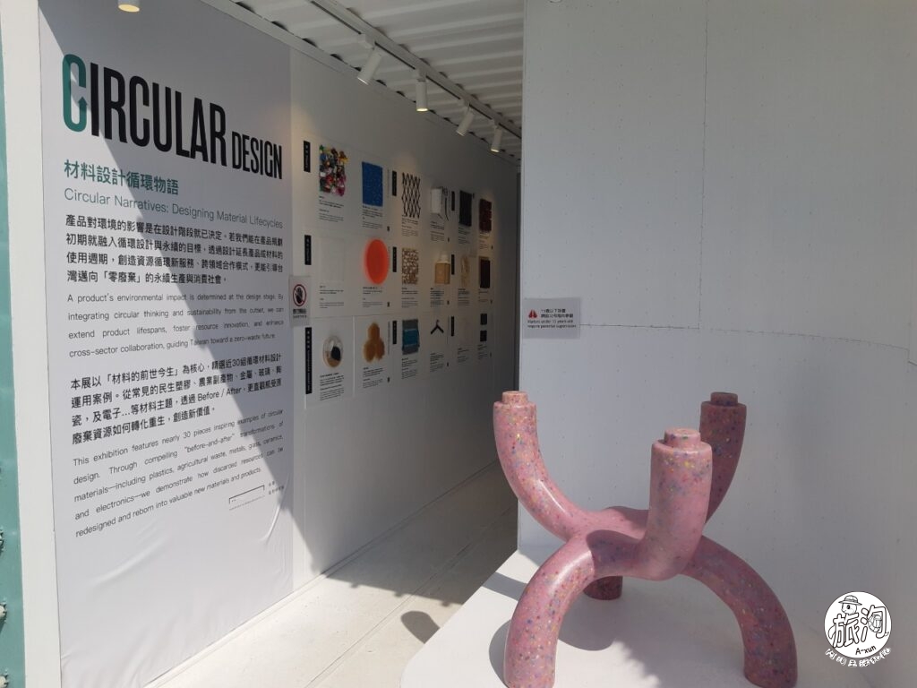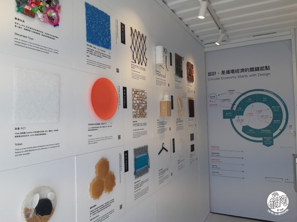 ▲展區列出不少廢棄材料,像是塑膠玩具、改質PCT、廢棄漁網,若是產品在設計時,便能考慮的材質的循環價值,便能體現「設計,是循環經濟的關鍵起點」ヾ(´ε`ヾ)