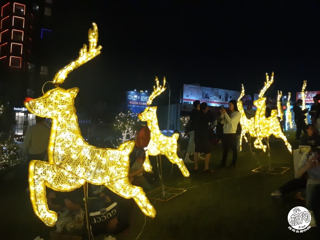 ▲更前面一點成群的麋鹿燈飾也是一堆人拍個不停~仔細看燈是上的麋鹿還有將紅鼻子做出來呢~細節有喔(~ ̄▽ ̄)~
