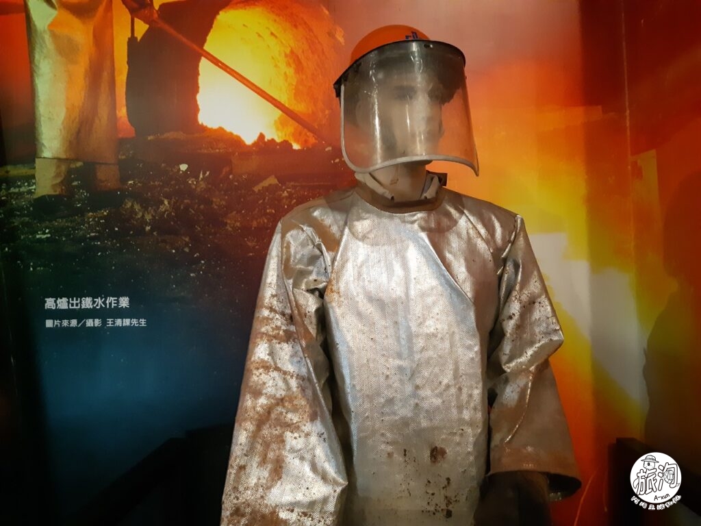 ▲出鐵作業員的全套服裝,從頭到腳都須做有防護,因為鐵水的溫度高達攝氏1000度以上(゚д⊙)